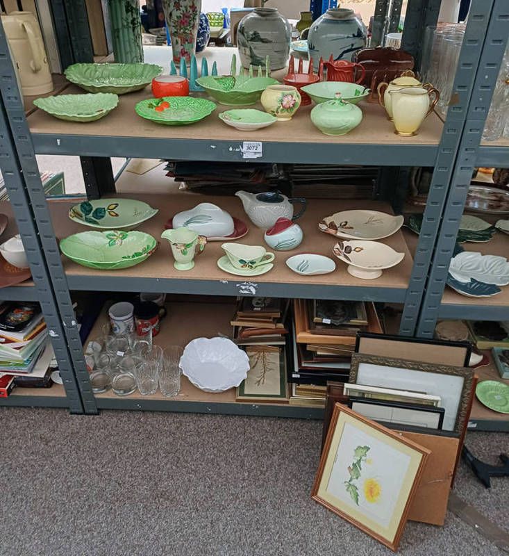 Selection of carlton ware including tea pot, toast rack, butter dish, etc, together with framed pictures, glasses, and others over three shelves