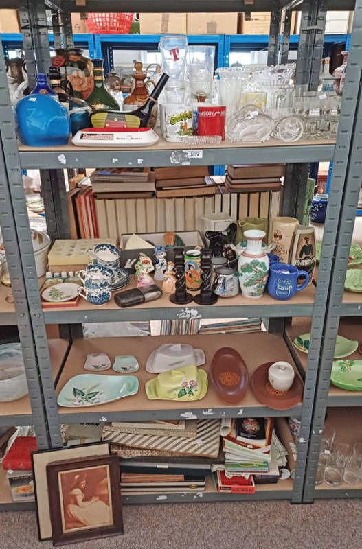 Selection of various items including carlton ware butter dishes, empty whisky decanters, candle sticks and others, over four shelves