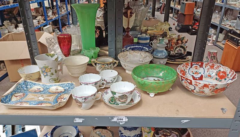 Selection of 19th century porcelain including imari bowl, cups & saucers, bowls, tray with gilt decoration, etc, over one shelf