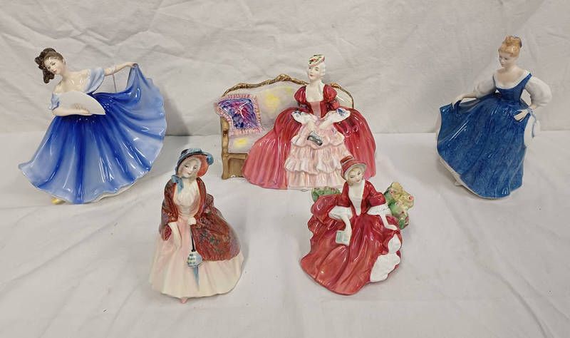 5 royal doulton figures, including hn 1988 paisley shawl, belle o' the ball hn 1997 etc