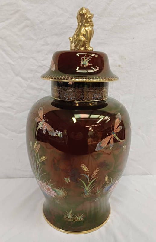 Carlton ware rouge royale temple jar decorated with waterlily, dragonfly & bullrushes, dog of fo to lid & paper label to underside - 50cm tall