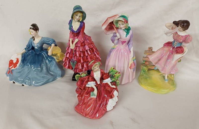5 royal doulton figures including priscilla hn 1340, miss demure hn 1402 etc