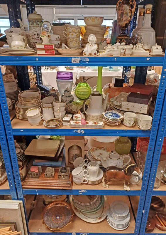 Large selection of porcelain etc, including oriental teaware, porcelain vases, etc, on 4 shelves