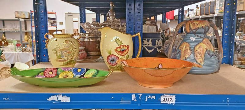 Selection of carlton ware including 2-handled night oak vase, hollyhocks bowls, yellow pagoda vase, etc, one shelf