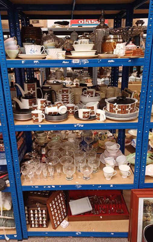 Selection of various items including soda siphon marked scottish co-operative society leith, j&g meakin dinnerware, canteen of cutlery and others over four shelves
