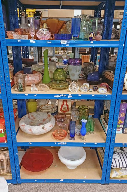Selection of various coloured glass including paperweights, vases, light shades and others over four shelves