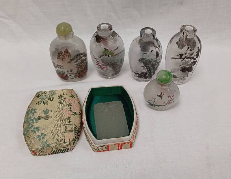 5 chinese inside painted glass snuff bottles & chinese carved jade panel
