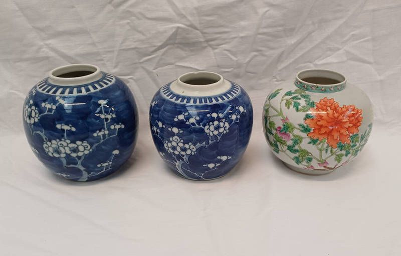 Pair of chinese blue & white jars decorated with flowers & chinese floral decorated vase each with double ring marks to base, tallest 12cm