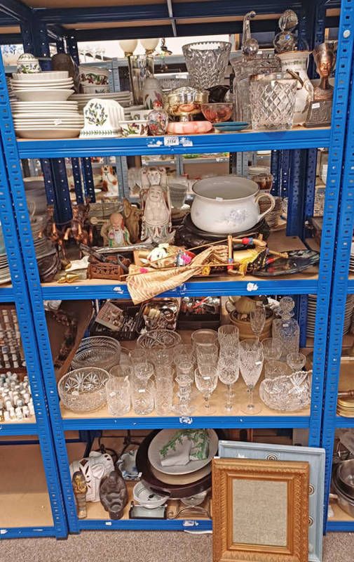Selection of various items including framed mirrors, crystal decanters, portmeirion dinnerware and others over four shelves