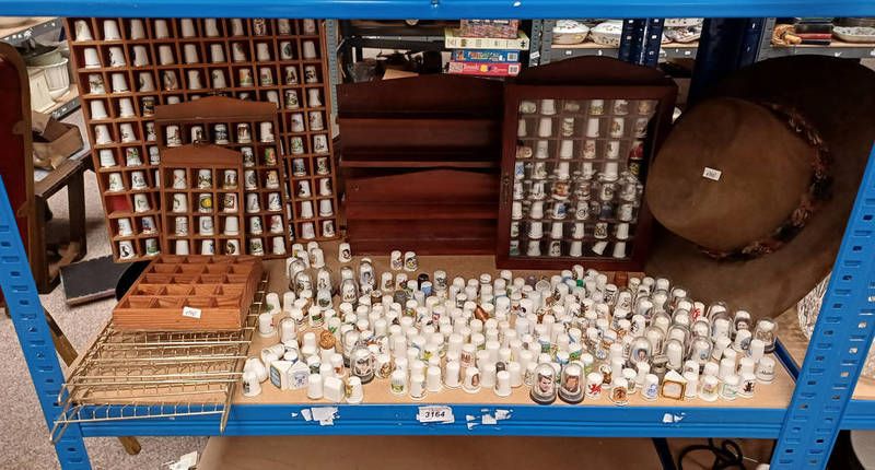 Selection of various crested thimbles together with display cases and hat over one shelf