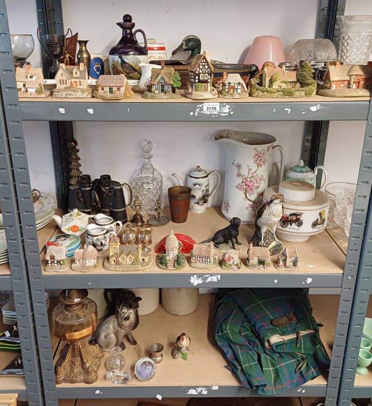 Selection of various items including border fine arts black labrador, lilliput lane and similar model cottages, beneagles whisky osprey decanter and others over three shelves