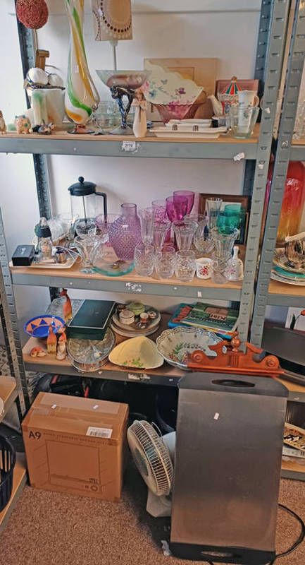 Selection of various items including carlton ware dish, willow tree figure, coloured glass wine glasses and others over four shelves