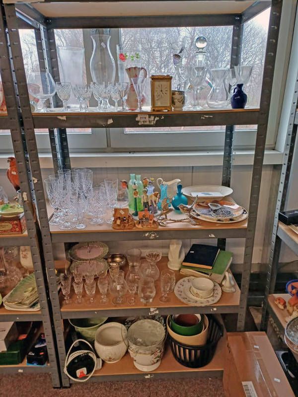 Selection of various items including carriage clock, lilliput lane cottages, plant pots and others over four shelves