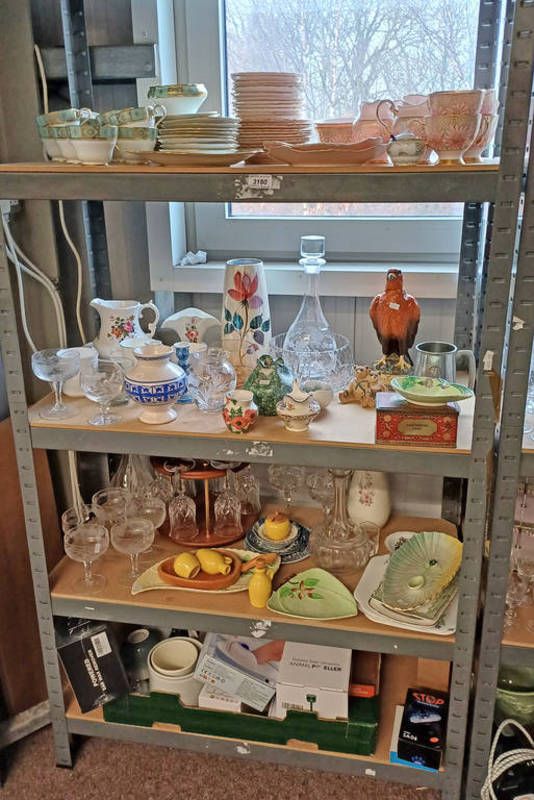 Selection of various items including tuscan porcelain tea set with pink floral decoration, carlton ware dish, ultrasonic animal repeller and others over four shelves