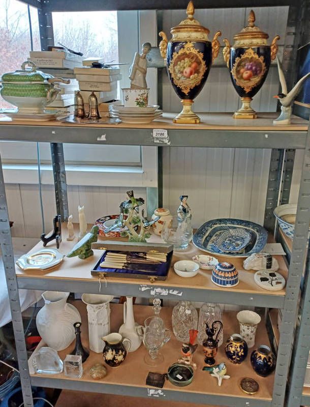 Selection of various items including goebel blue tit figure set, kaiser porcelain vases, coalport urn vases with fruit decoration and other over three shelves
