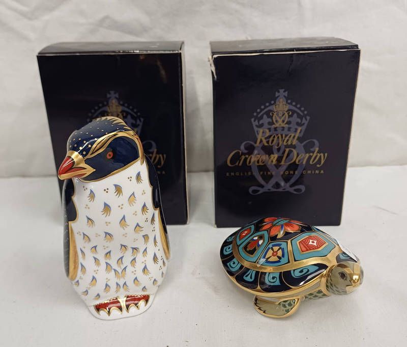 2 royal crown derby boxed paperweights with gold stoppers - rock hopper penguin & terrapin