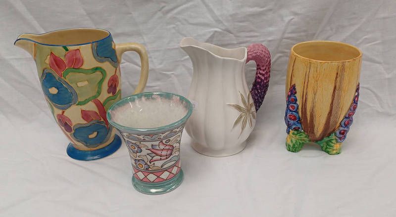 Clarice cliff fantasque jug, royal staffordshire clarice cliff lupin jug, clarice cliff my garden vase & bursley ware charlotte rhead tapering vase - tallest 18cm