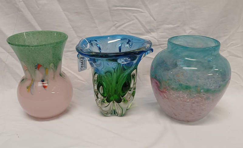 Selection of cranberry glass including jugs, vases, etc, and pair of blue frilled glass vases,...
