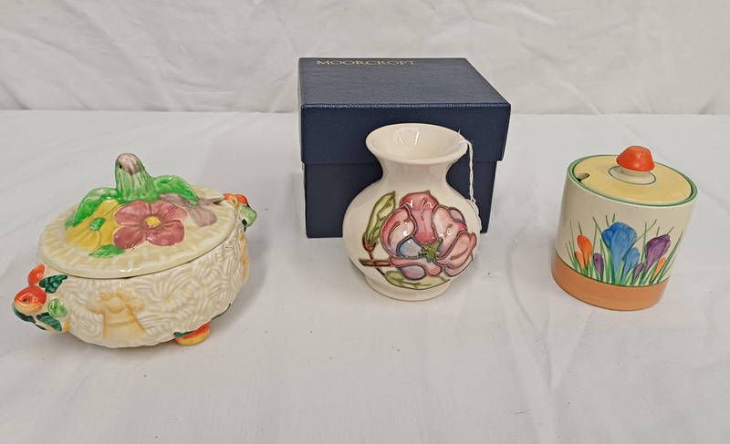 Clarice cliff celtic harvest jam pot, royal staffordshire clarice cliff crocus jam pot & moorcroft squat baluster vase - boxed