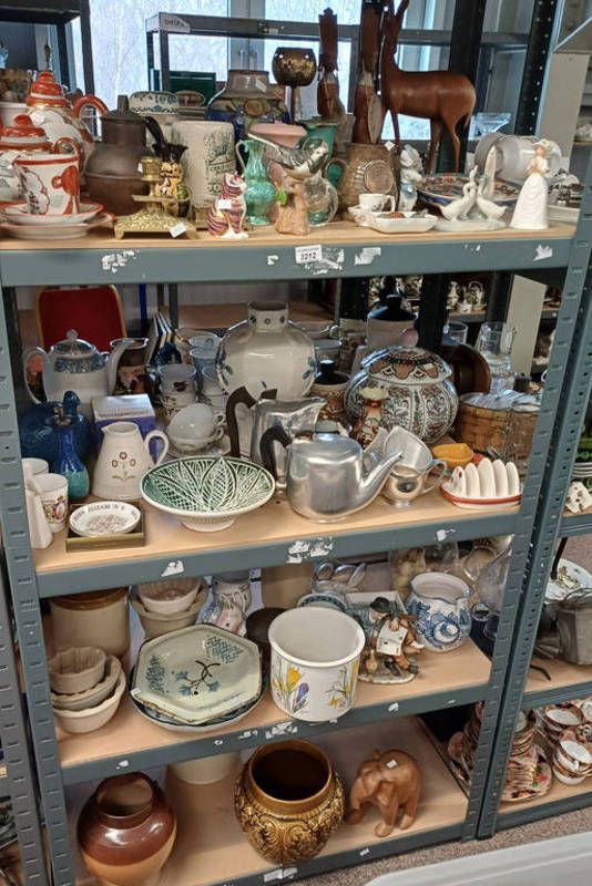 Selection of various items including royal crown derby cat paperweight with gold stopper, portmeirion plant pot, wooden elephant and others over four shelves