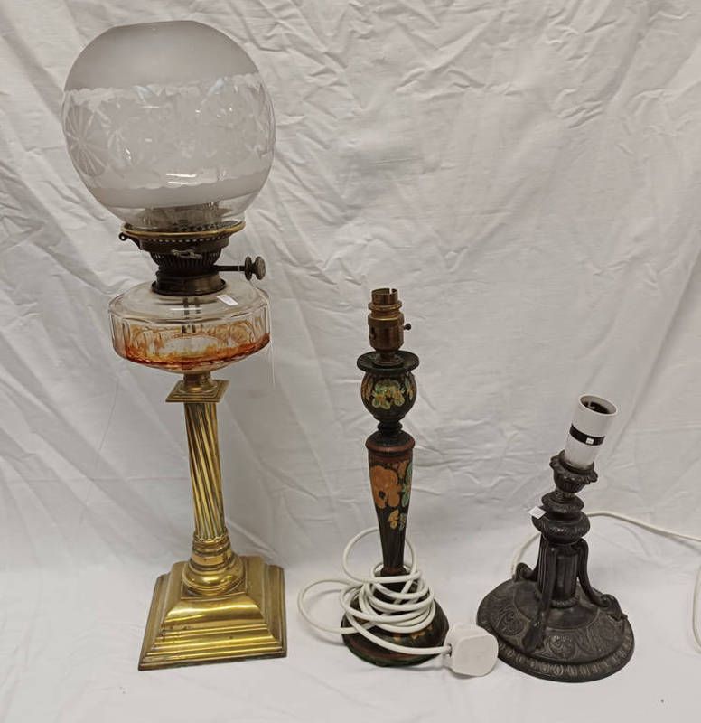 Brass paraffin lamp with clear glass font, etched glass shade & twist column on square base & 2 other table lamps