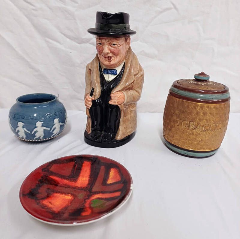 Doulton lambeth blue glazed pot decorated with dancing children, doulton tobacco jar, royal doulton winston churchill toby jug & poole pottery dish