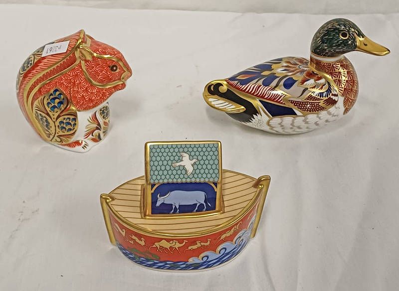 Three royal crown derby paperweights to include red squirrel & mallard duck, both with silver stoppers, and noah's ark, lacking stopper