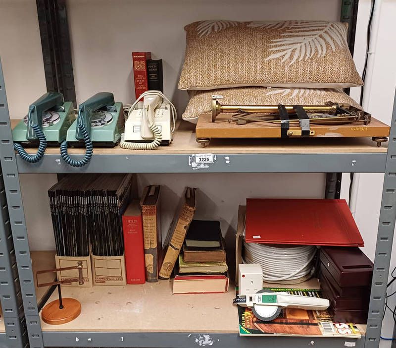 Selection of various items including rotary telephones, cushions, scales and others over two shelves