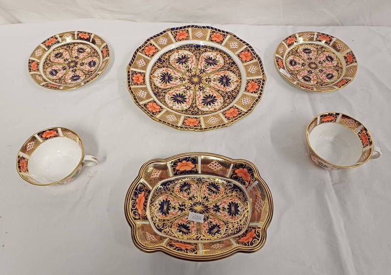 Selection of royal crown derby old imari pattern porcelain to include 1126 pattern scalloped plate 22.5cm, 1128 pattern pin dish 18.5cm, and 6149 pattern cup & saucers
