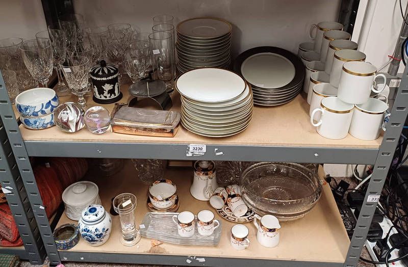 Selection of various items including roslyn porcelain tea set with haddon pattern, glass paperweights, crystal decanters and others over two shelves