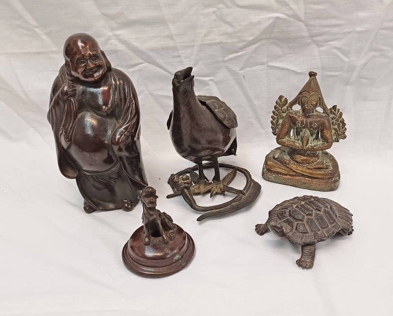 19th century japanese bronze bird censor, oriental bronze figure of a laughing buddha, tibetan bronze figure of a deity, etc - tallest 16cm