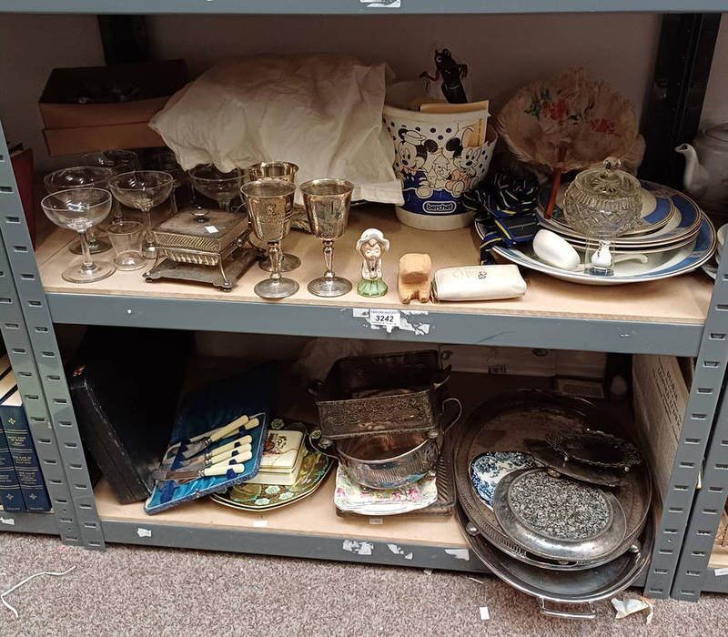 Selection of various items including cased cutlery, silver plate trays, champagne coupes and others over two shelves