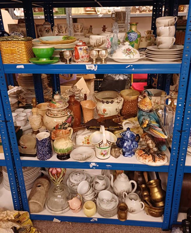 Selection of various items including cheese dishes, oriental vase with warrior decoration, tea sets and others over three shelves
