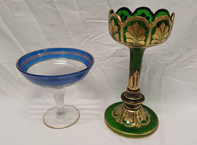 19th century gilt decorated green glass tapering vase and gilt decorated blue & clear glass tazza, tallest 28cm