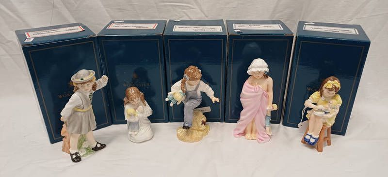 Five royal worcester porcelain katies day figures including playtime, bedtime, tea time and school time. all boxed