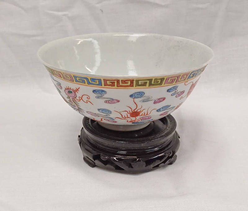 Chinese porcelain bowl decorated with dragon & exotic bird, 6-character mark to base - 12.5cm diameter