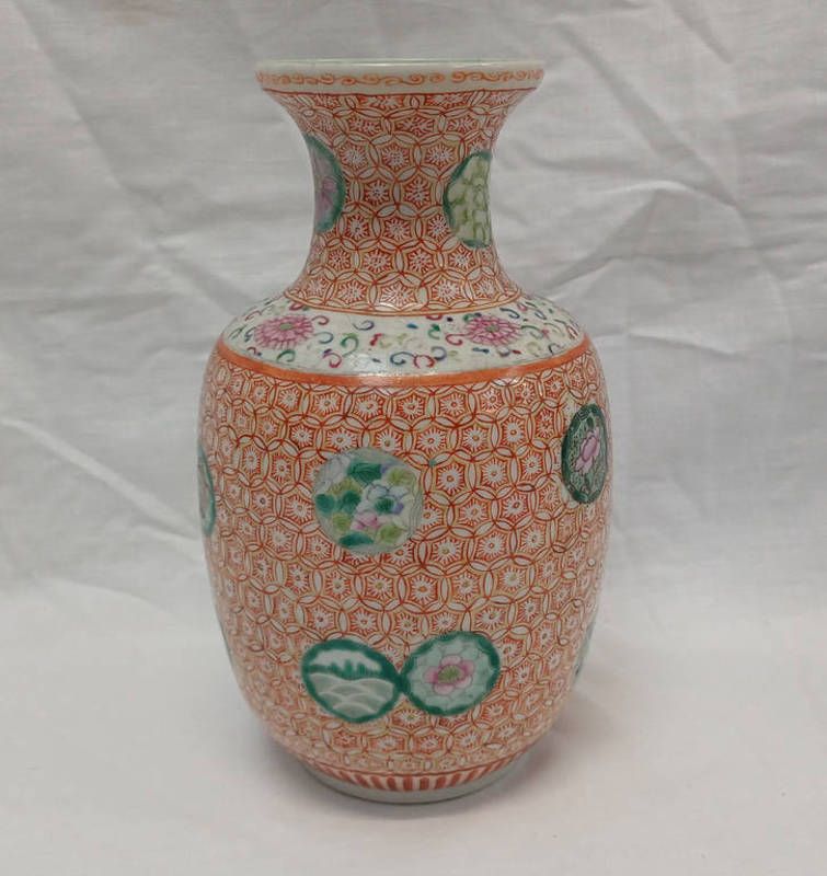 Chinese red & white vase with floral decorated circular panels & seal mark to base - 20.5 cm tall
