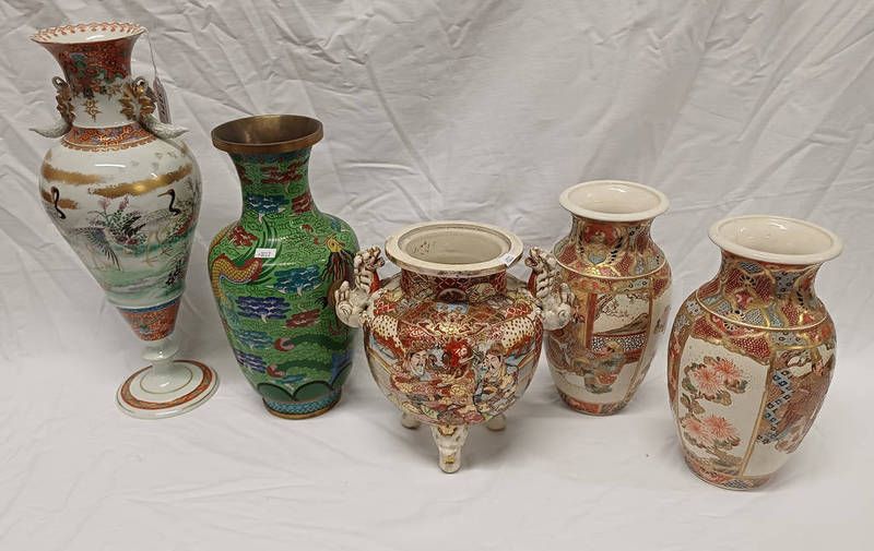 Oriental tapering pedestal vase decorated with birds - 41cm tall, 3 japanese pottery vases & cloisonne vase