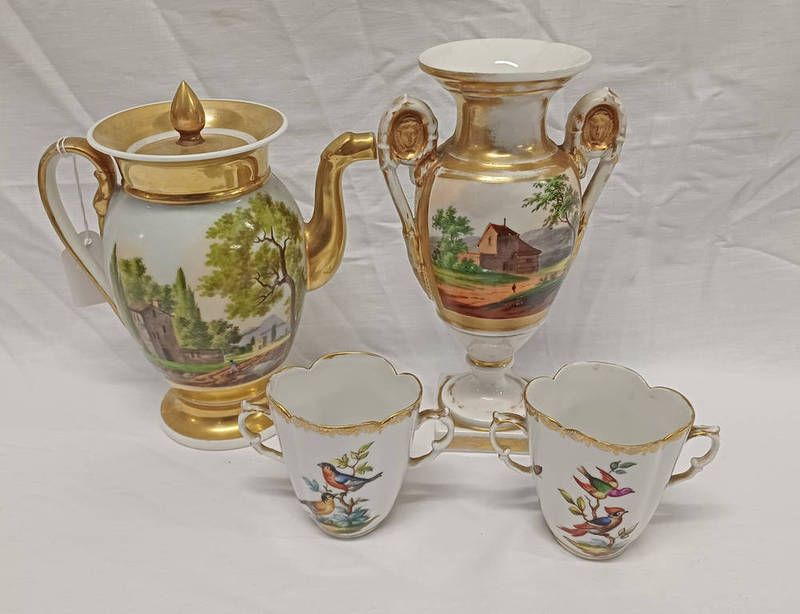Pair augustus rex porcelain twin handled chocolate cups decorated with birds, 19th century paris porcelain coffee pot & porcelain vase.
