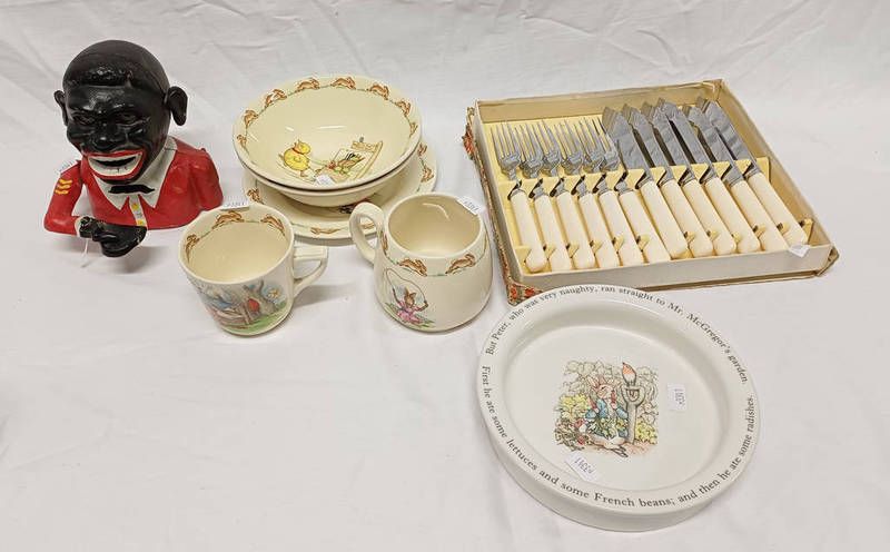 Selection of royal doulton bunnykins porcelain together with ethnic money bank etc