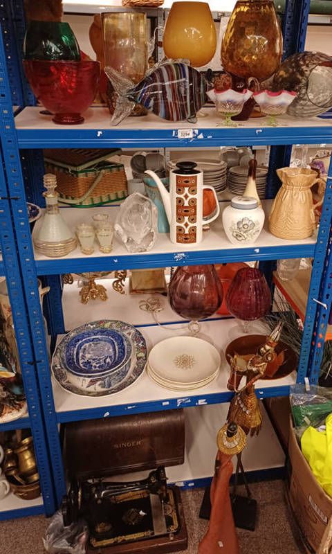 Selection of coloured glass vases etc together with paperweight, wedgwood ginger jar, decorative figures singer sewing machine on 4 shelves