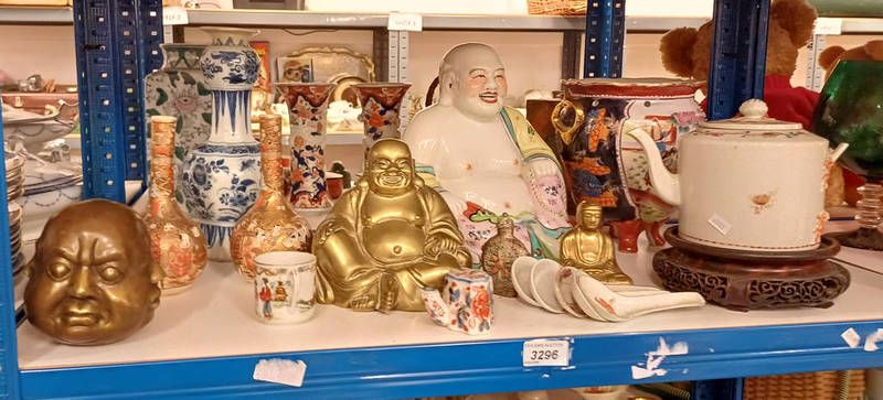 Selection of chinese and other porcelain, etc including tea pot on hardwood stand, blue & white vase with floral decoration, brass buddha etc over one shelf