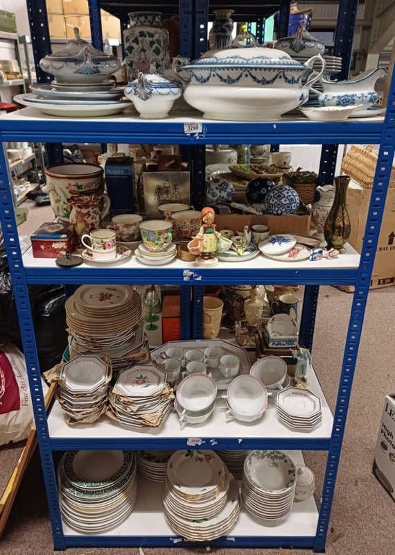 Selection of various items including goebel figures, masons jug, blue & white porcelain balls & others over 4 shelves