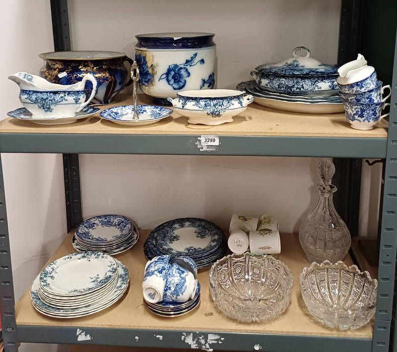Selection of various items including porcelain dinnerware, crystal decanter, cups & saucers with floral decoration, etc over 2 shelves