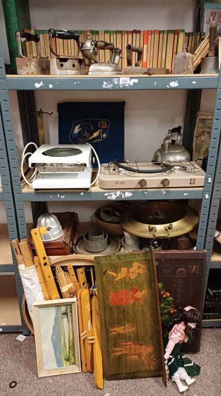 Selection of various items including campingaz of 200 double gas stove, books, framed picture & others over 4 shelves