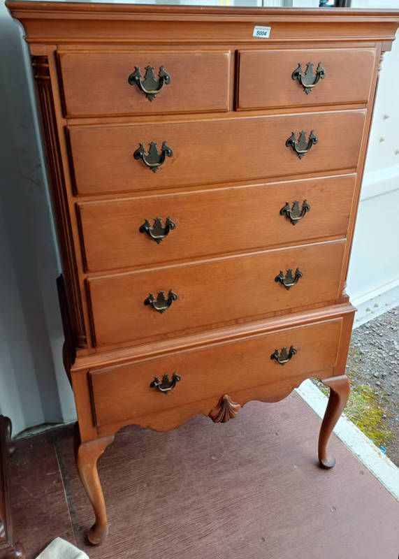 Hardwood chest on stand with 2 short over 4 long graduated drawers on queen anne supports, 147cm tall x 87cm wide
