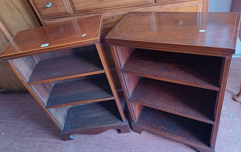 2 late 19th century inlaid mahogany adjustable open bookcases on bracket supports, 89cm tall x 56cm wide