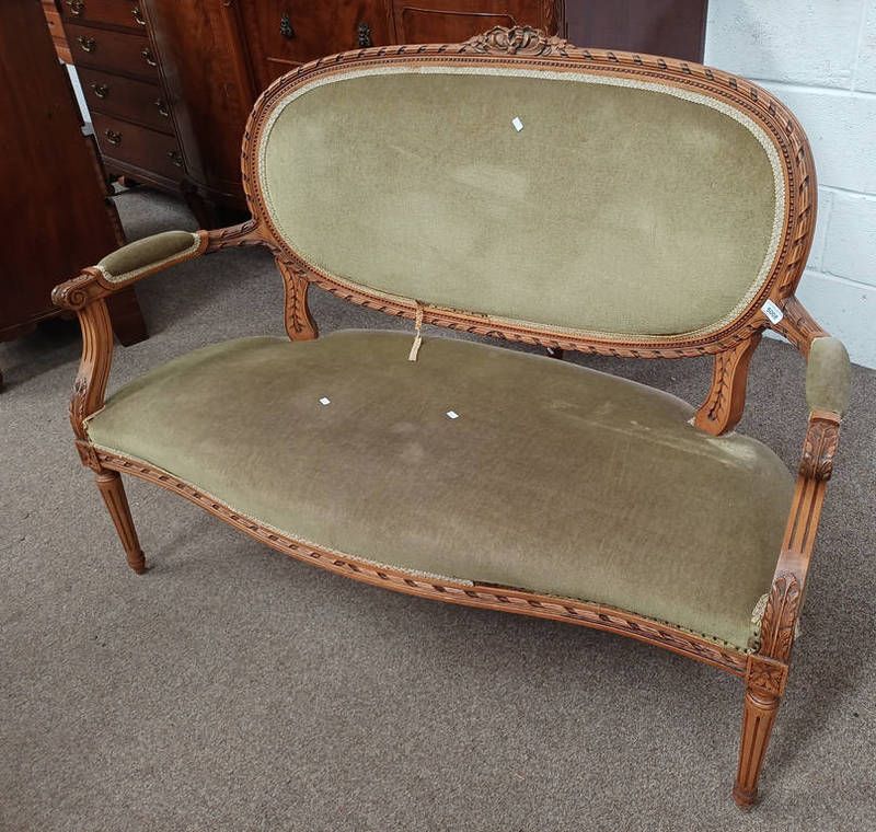 19th century style walnut framed parlour settee with carved decoration on reeded supports