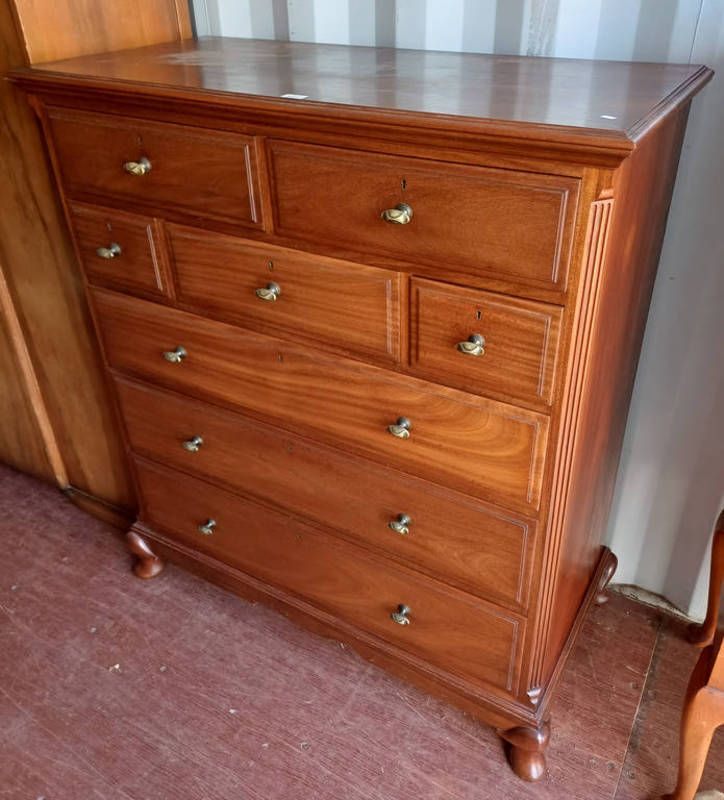 Late 20th century hardwood chest with an arrangement of 5 short over 3 long drawers with stylized brass knobs on short queen anne supports, 130cm tall x 115cm wide
