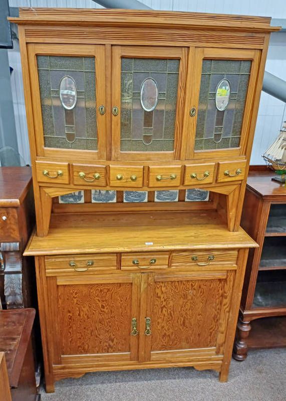 Early 20th century pine dresser. the bow front shelf back with 3 stained leaded glass panel doors over 6 short drawers. the base with 3 drawers over 2 panel doors - 204 cm tall x 120 cm wide